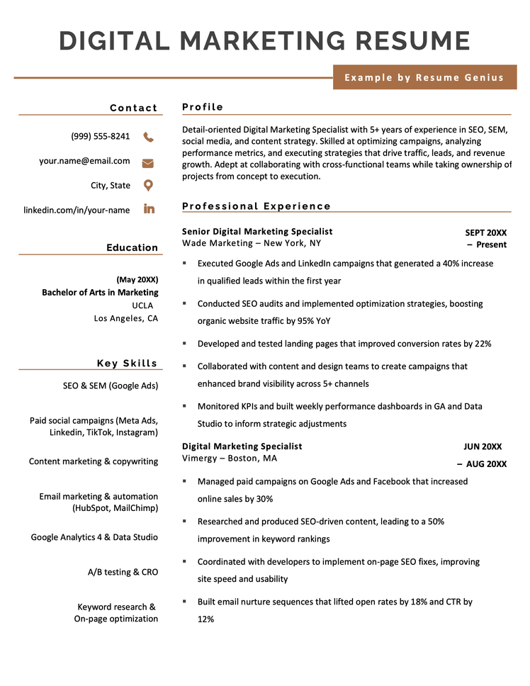 Check out this digital marketing resume from our content manager, Conrad Benz. Using this resume, he snagged a job at Resume Genius: